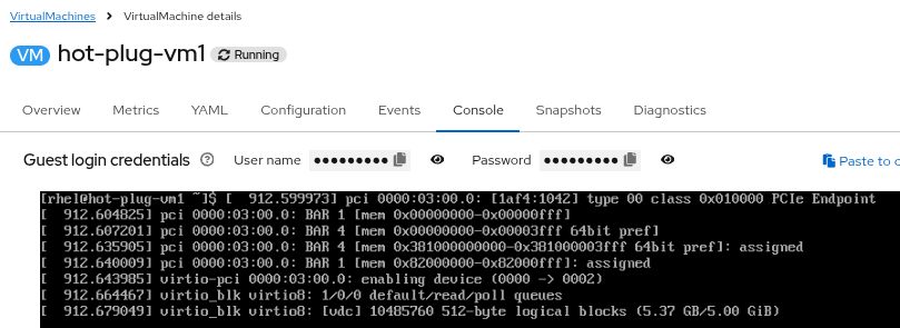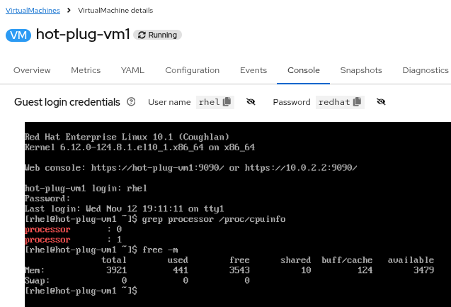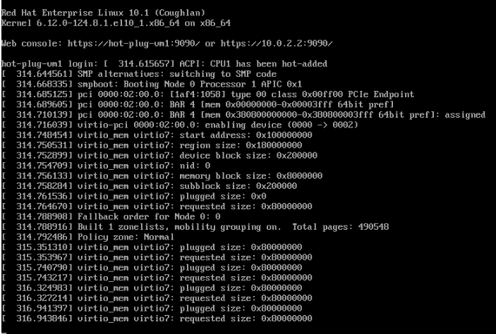 Click on the Console tab and view the console window of the VM. You will see messages from the kernel that additional CPU and memory are now available.