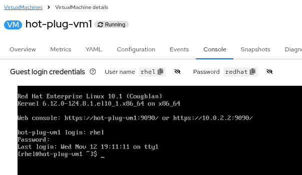 Verify the new resources by logging in to the VM using the credentials at the top of the console window. In this case, the username is rhel and the password is redhat.