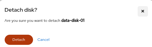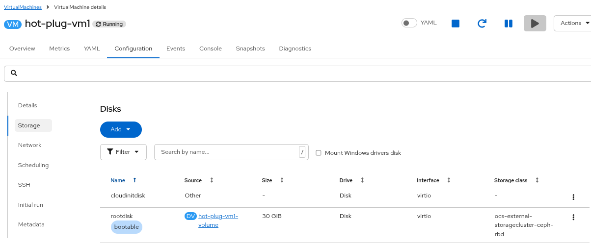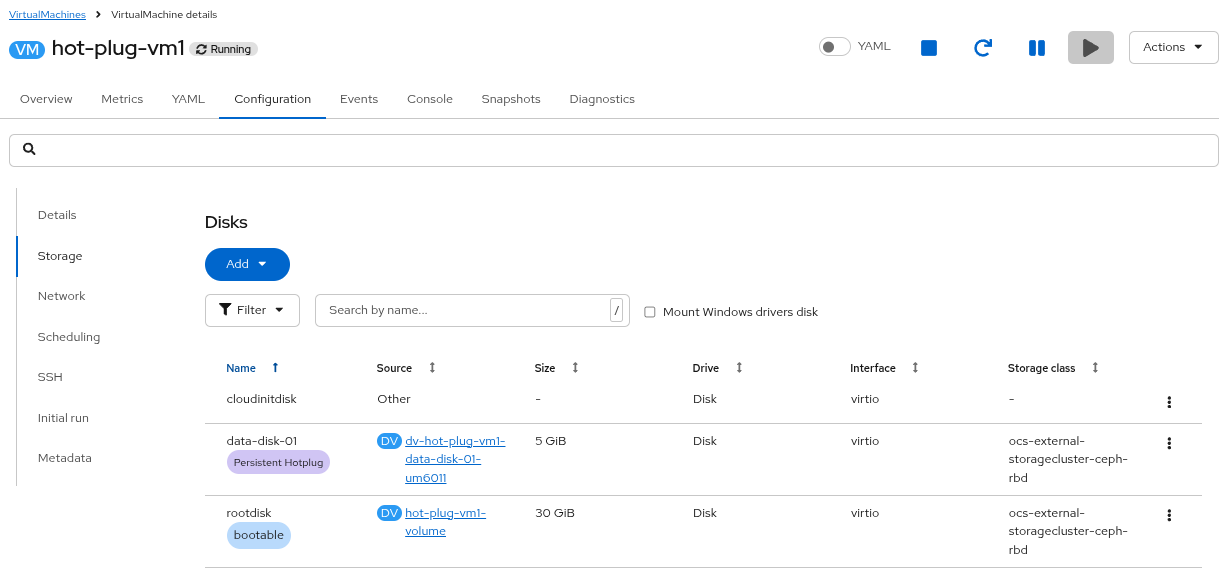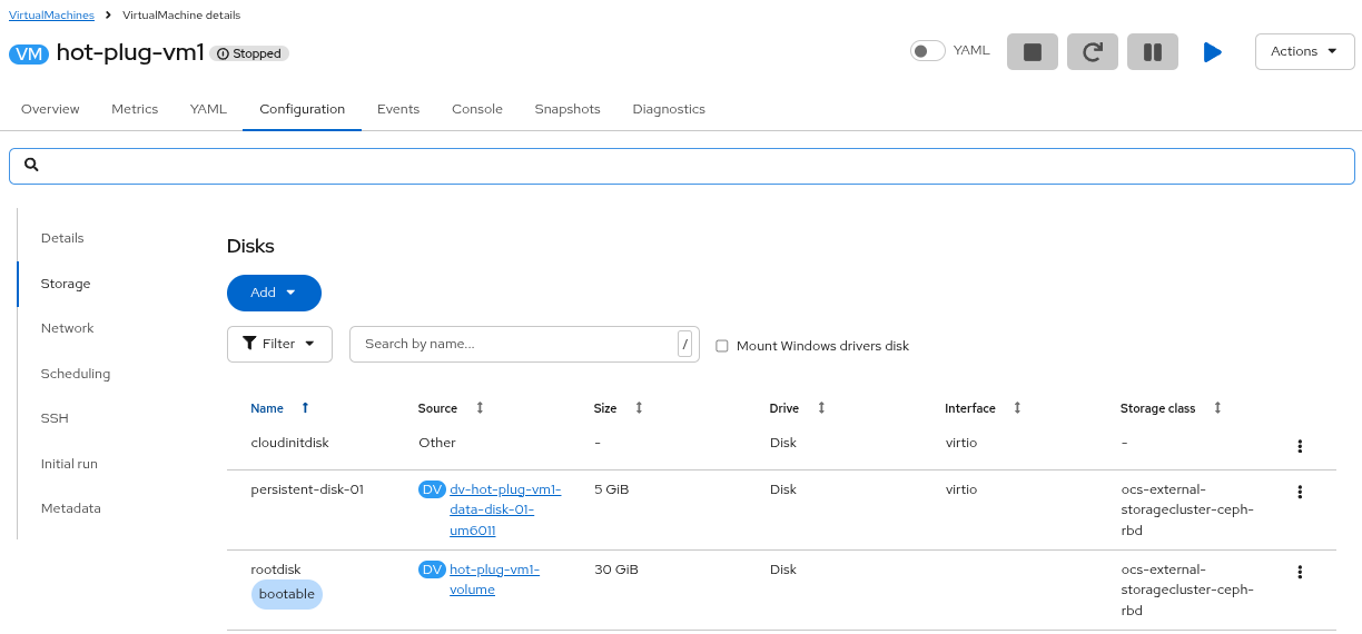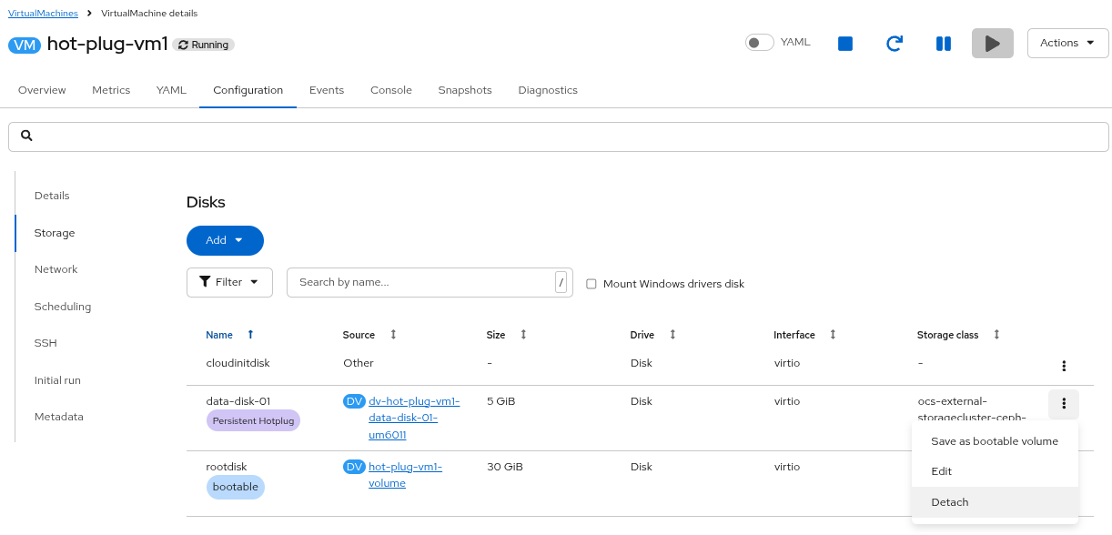 Now you will remove the hot-plugged disk from the virtual machine. If you mounted the hot-plugged disk on your system, make sure to umount it before proceeding. Navigate to the hot-plug-vm1 virtual machine and then click on Configuration → Storage. Note the name of the PVC that you will remove (e.g. dv-hot-plug-vm1-data-disk-01-um6O11) because you may want it for the Bonus Lab later! Click on the three dots on the right side of the hot-plugged disk and select Detach.