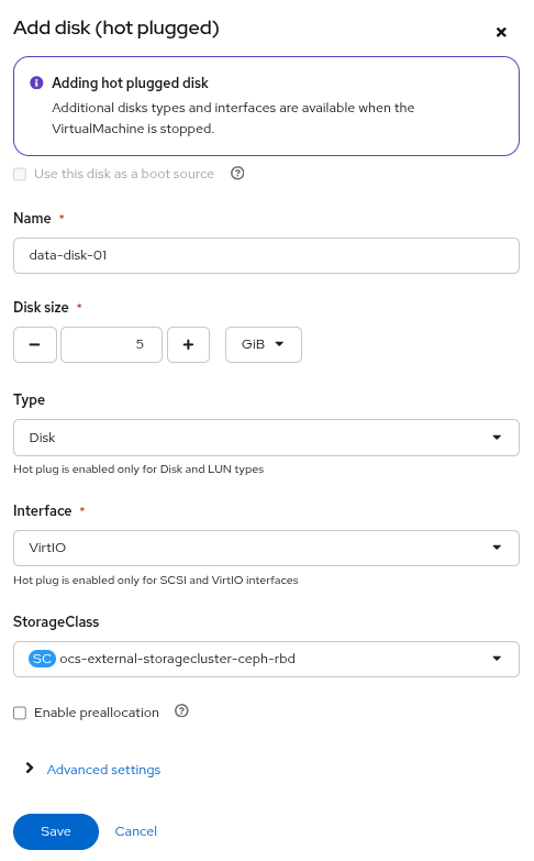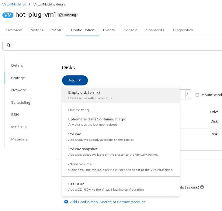 The steps below are optional as they do not directly relate to hot plugging a new disk. However, it may be advantageous for you to know about converting a hot-plugged disk to a standard disk, which requires a VM restart.