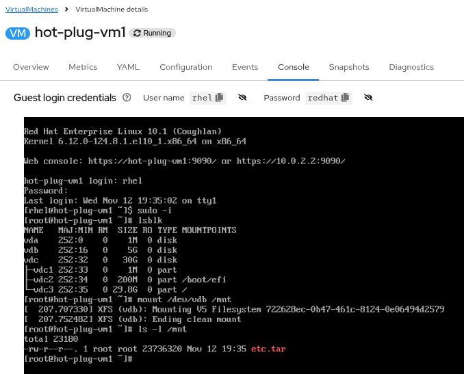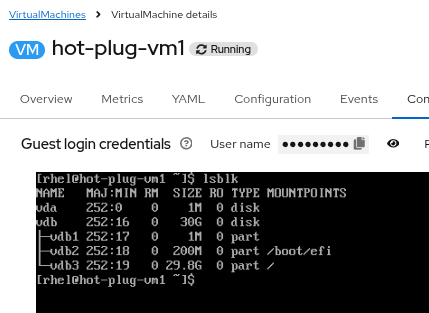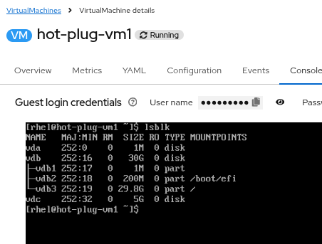 Confirm in the VM that the disk (vdc) has been removed by logging into the virtual machine with the credentials in the Console tab, then running the lsblk command. The hot-plugged disk is no longer present on the system.