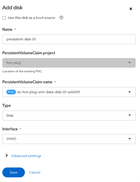 Give the disk a name, if desired, and select the previously disconnected PVC name in the PersistentVolumeClaim name menu (e.g. dv-hot-plug-vm1-data-disk-01-um6O11)