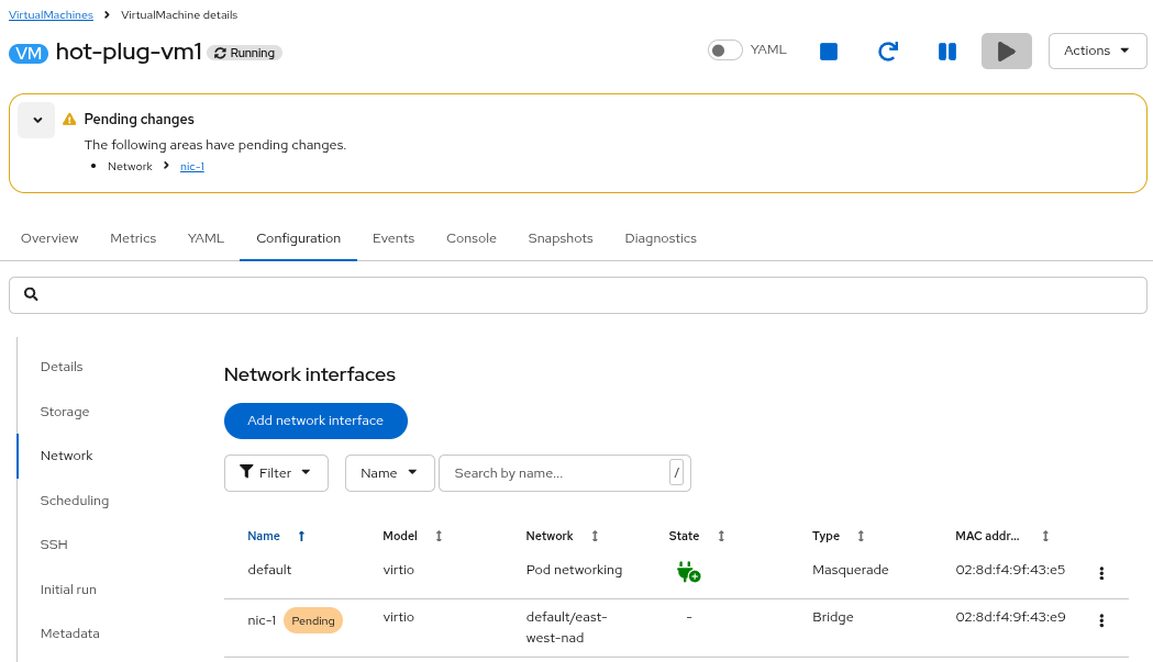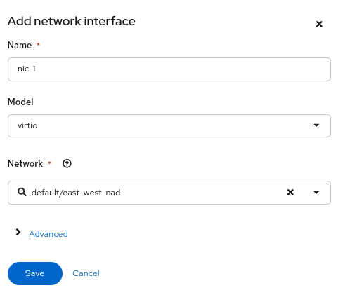 Back in the Network configuration screen, click on the button “Add network interface”. Provide a name for the new interface, such as nic-1. The model should be virtio, and the Network should be default/east-west-nad. Click on the Save button.