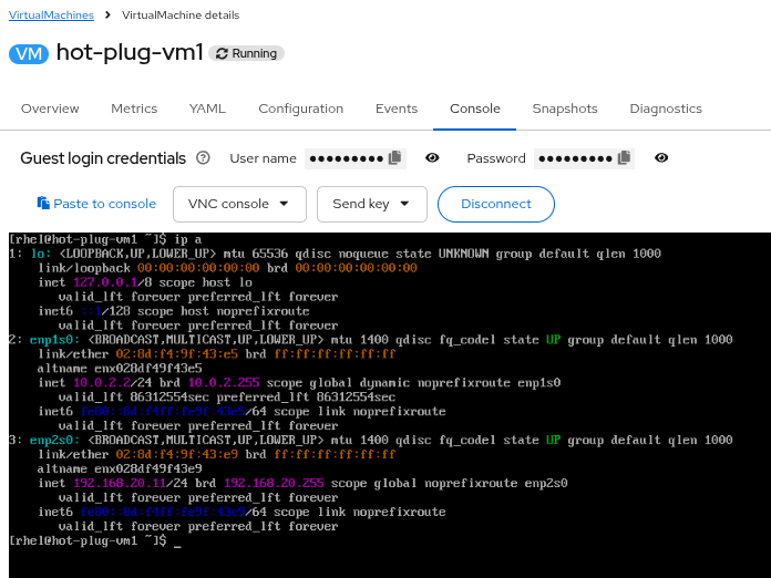 Navigate back to the Console tab and you may see messages have appeared on the VM console that new hardware has been added. You can view the new NIC from the operating system by running the command ip address and viewing the output.