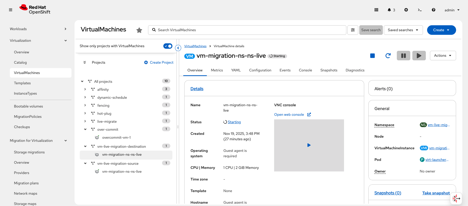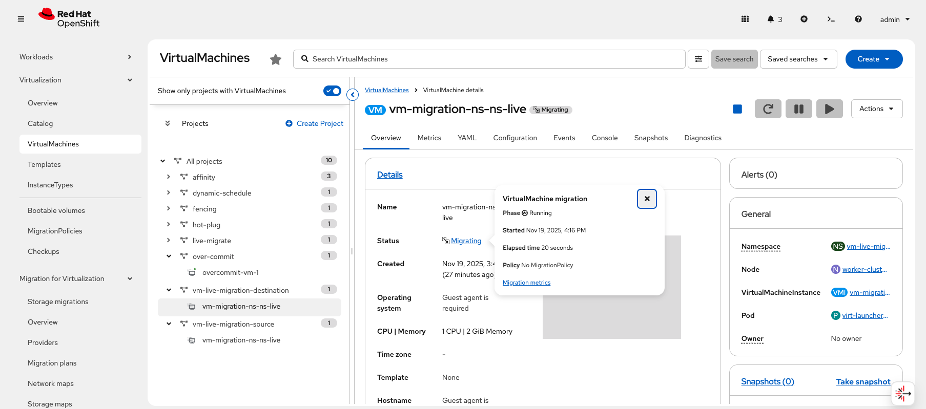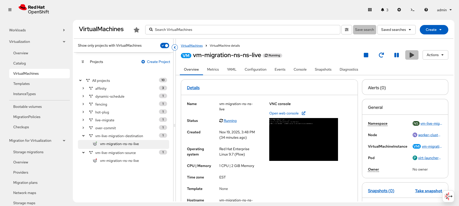 When the source VirtualMachineInstanceMigration above is created, the migration will start. You can monitor the migration through the CLI or the Console.