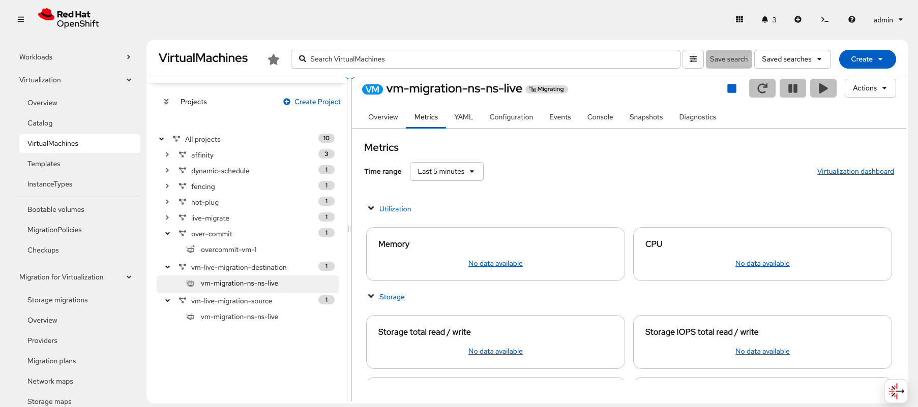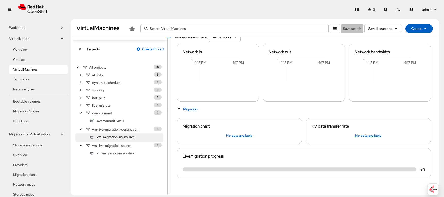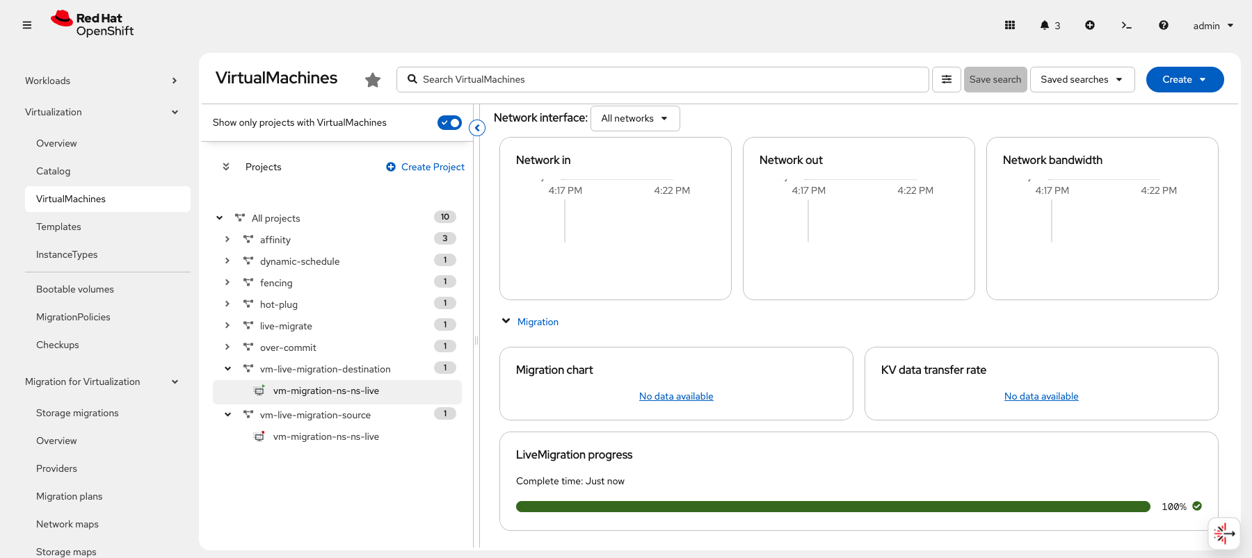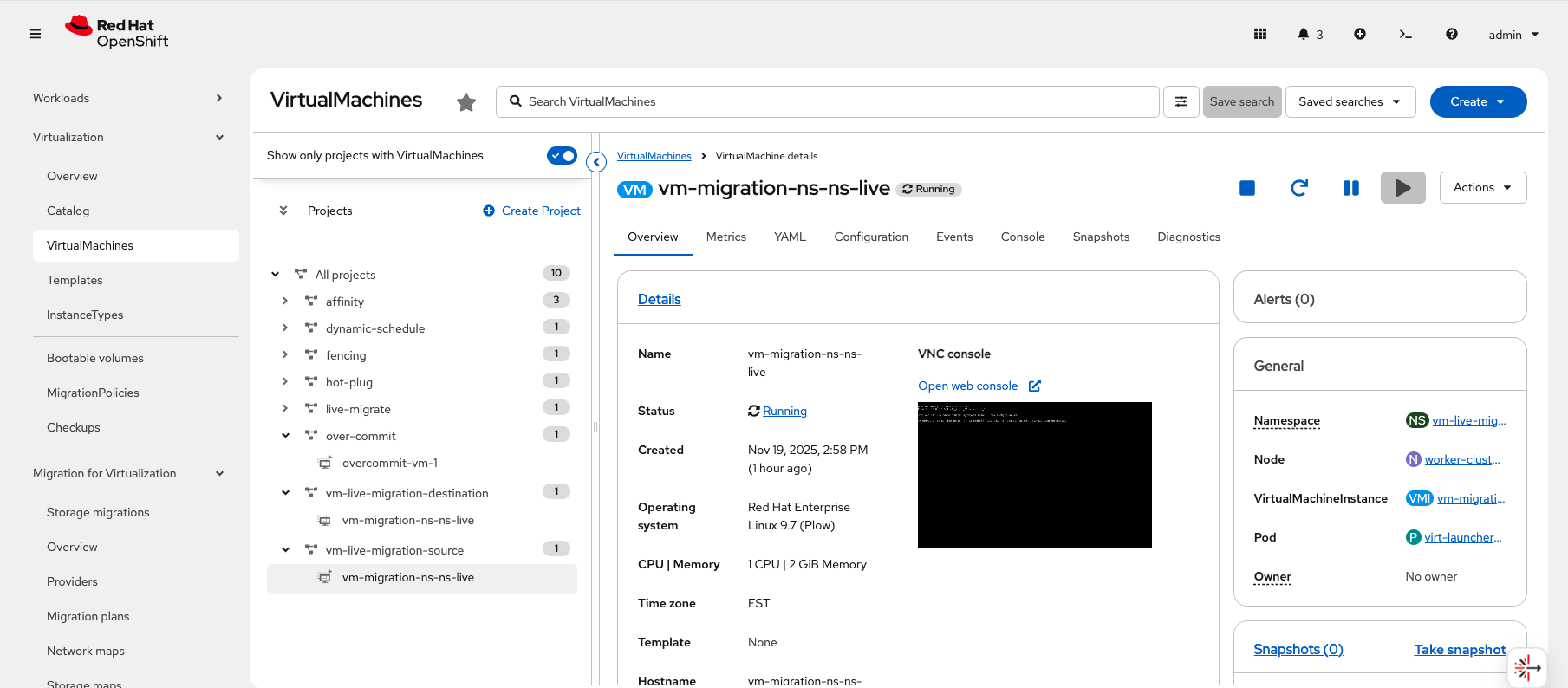 When the source VirtualMachineInstanceMigration above is created, the migration will start. You can monitor the migration through the CLI or the Console.