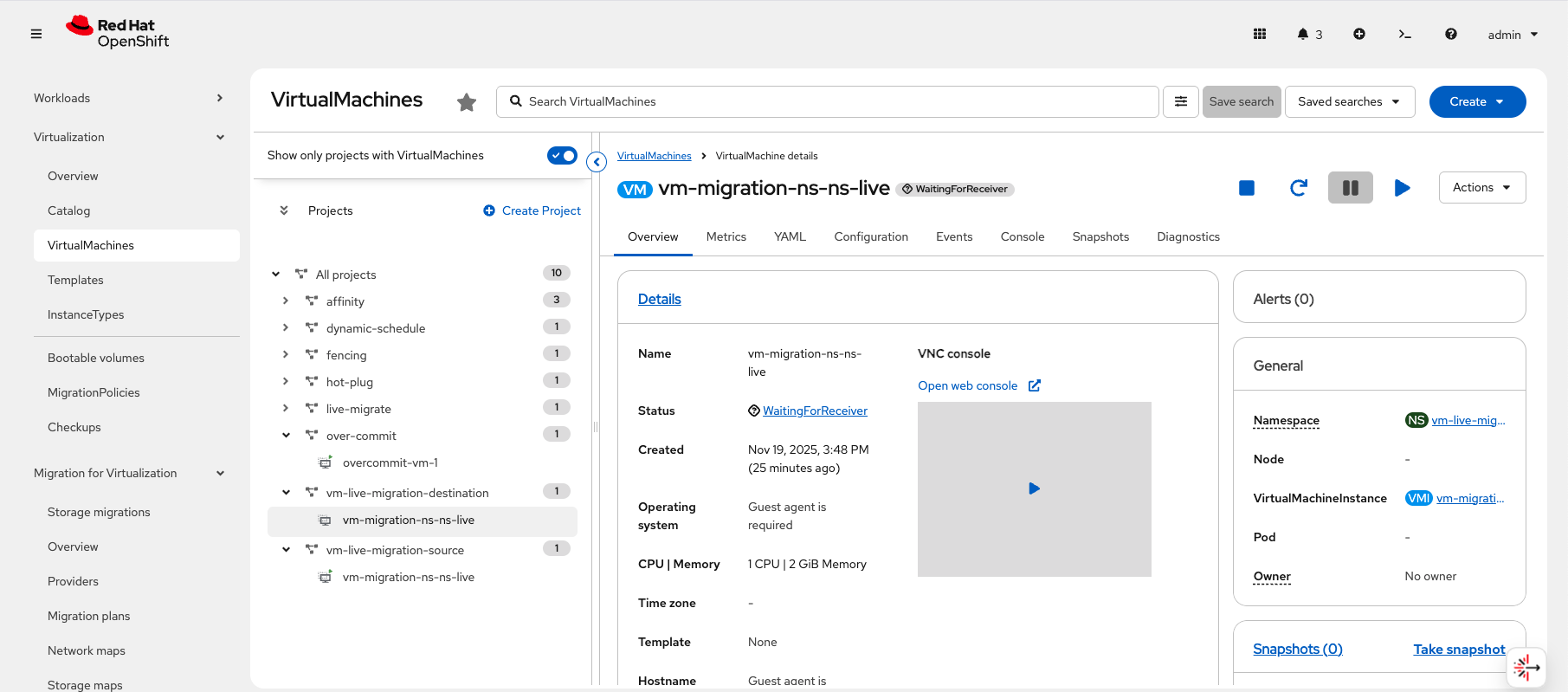 oc get VirtualMachine -n vm-migration-ns-ns-liveNAME AGE STATUS READY vm-migration-ns-ns-live 5m51s WaitingForReceiver Falseoc get VirtualMachineInstance -n vm-migration-ns-ns-liveNAME AGE PHASE IP NODENAME READY vm-migration-ns-ns-live 5m55s WaitingForSync FalseYou will notice that the VirtualMachine and VirtualMachineInstance have a unique PHASE, WaitingForReceiver and WaitingForSync. This indicates the VirtualMachine is waiting for the migration to start as a receiver and the VirtualMachineInstance is waiting for data to be synchronized from the source VirtualMachine.