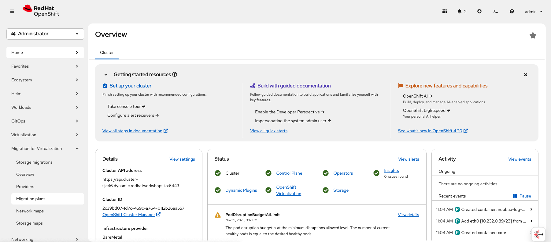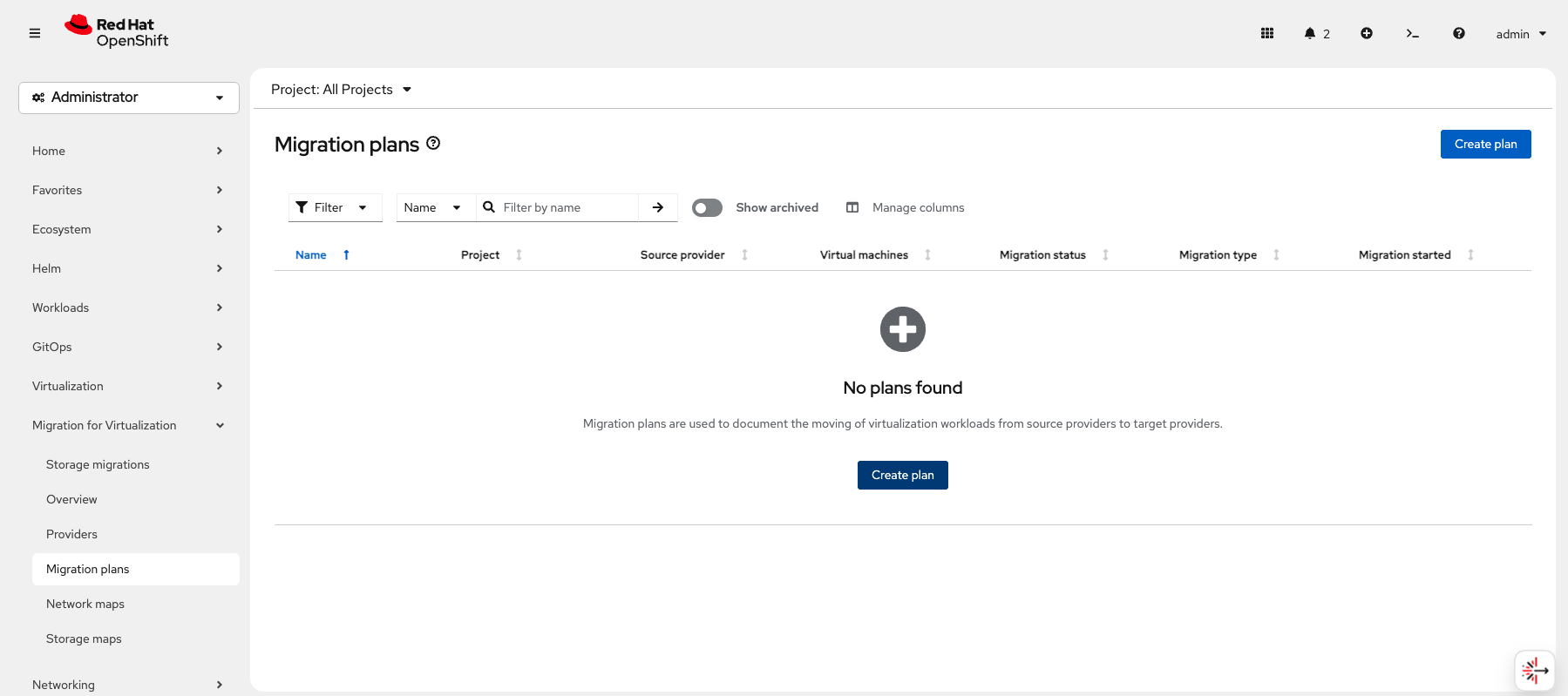 From the Console left hand menu, navigate to Migration for Virtualization and click Migration plans.