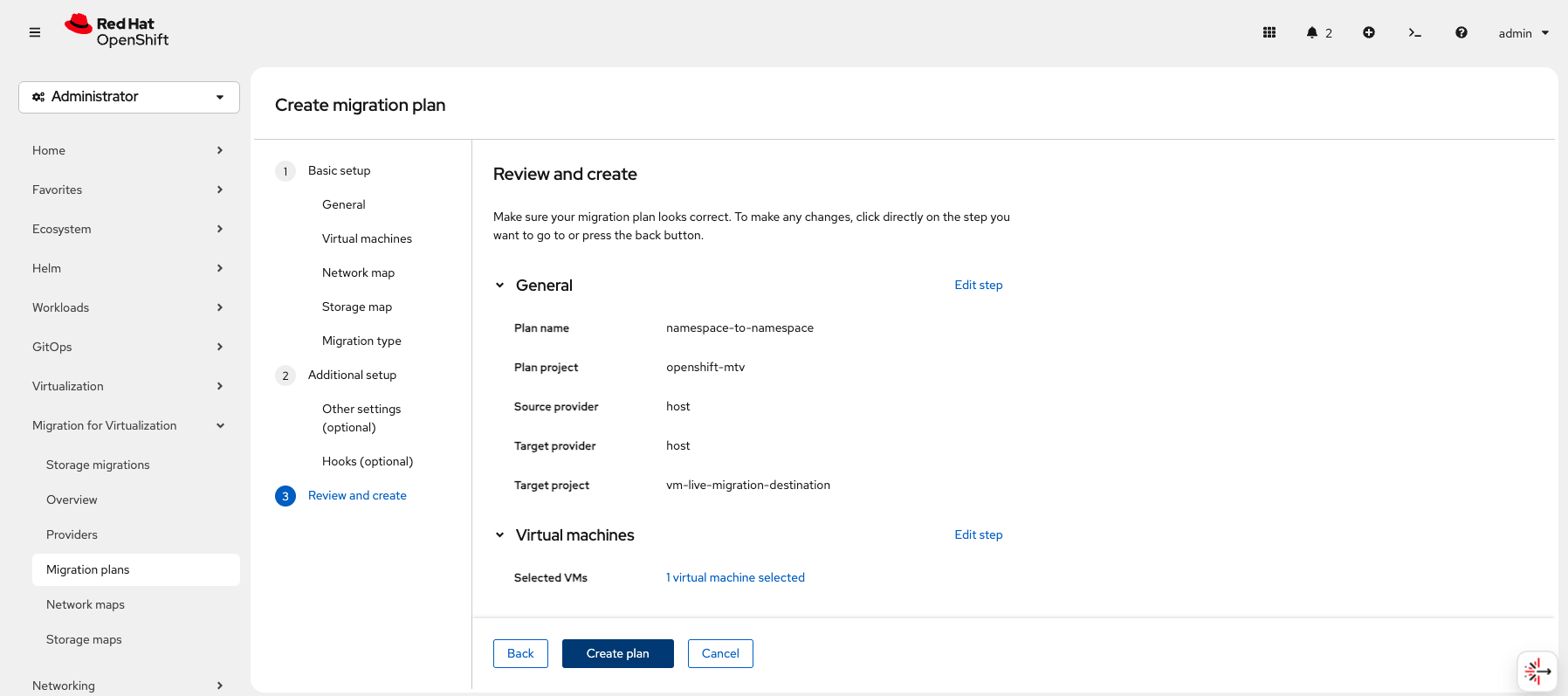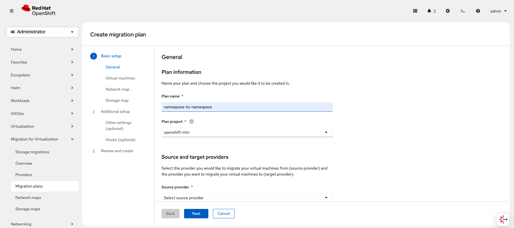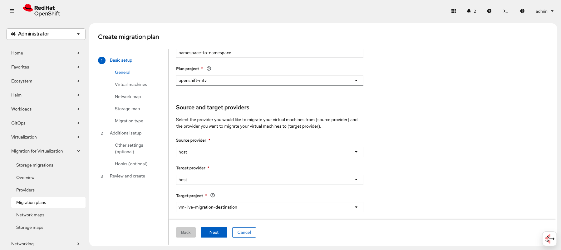 namespace-to-namespace. Leave the Plan project as the default value of openshift-mtv. -