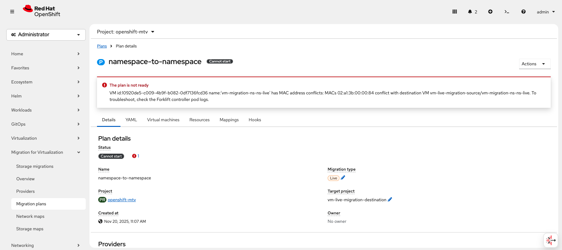 In our case, we see The plan is not ready due to a MAC address conflict. Once this issue is resolved, the migration will complete successfull with no other changes in the workflow.
