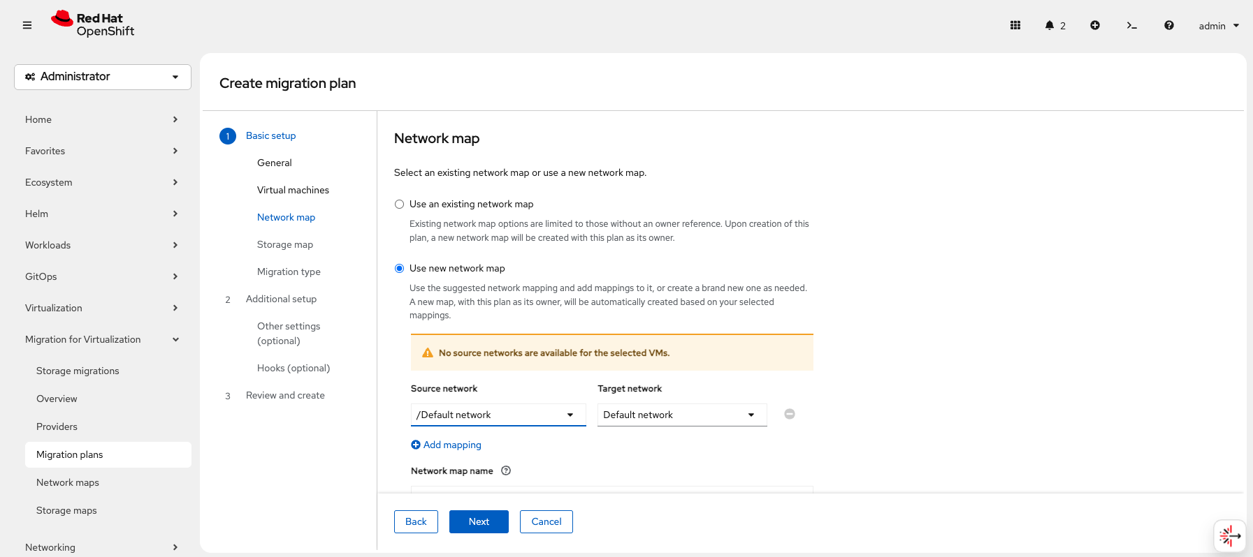 On the Network Map page, select Use new network map and select /Default network as the Source network. The Target network should already be set to Default network.