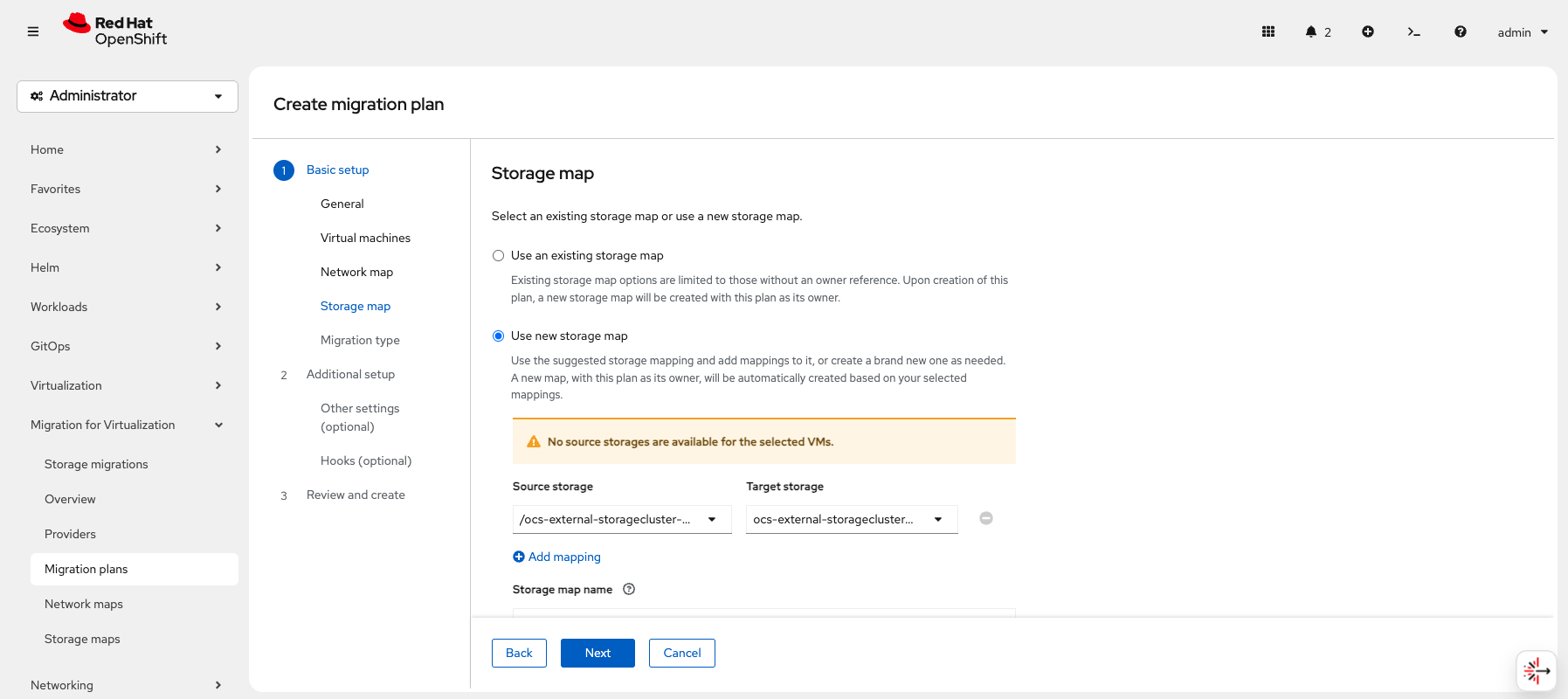 On the Storage Map page, select Use new storage map and select ocs-external-storagecluster-ceph-rbd as the Source storage. The Target storage should already be set to ocs-external-storagecluster-ceph-rbd.