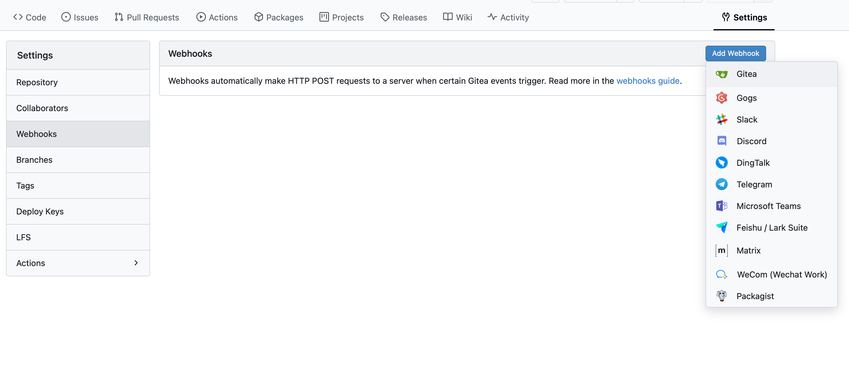 Click on Webhooks, then the Add Webhook button, and finally select Gitea.