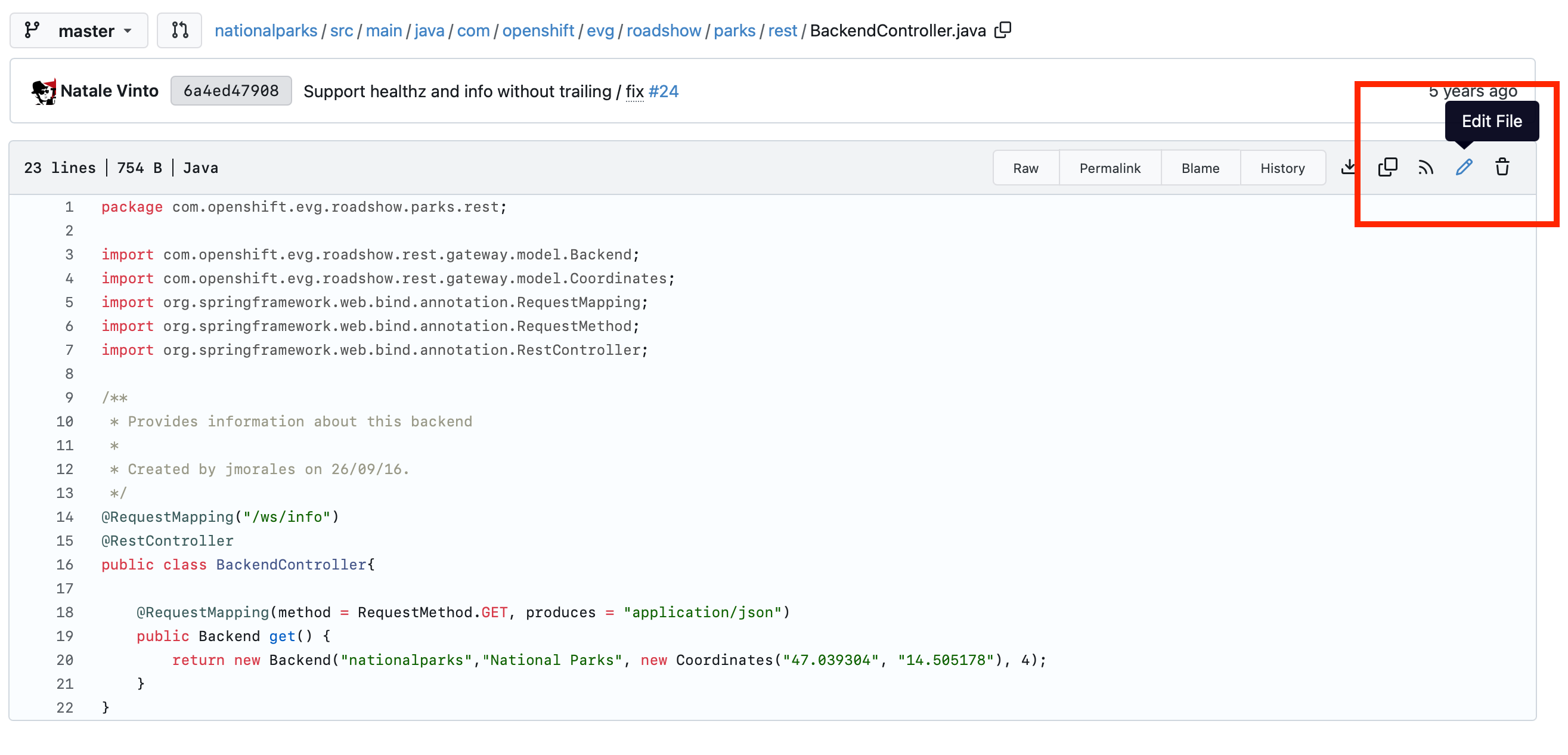 In the Gitea tab, open the nationalparks repository and navigate to src/main/java/com/openshift/evg/roadshow/parks/rest to find the BackendController.java file.