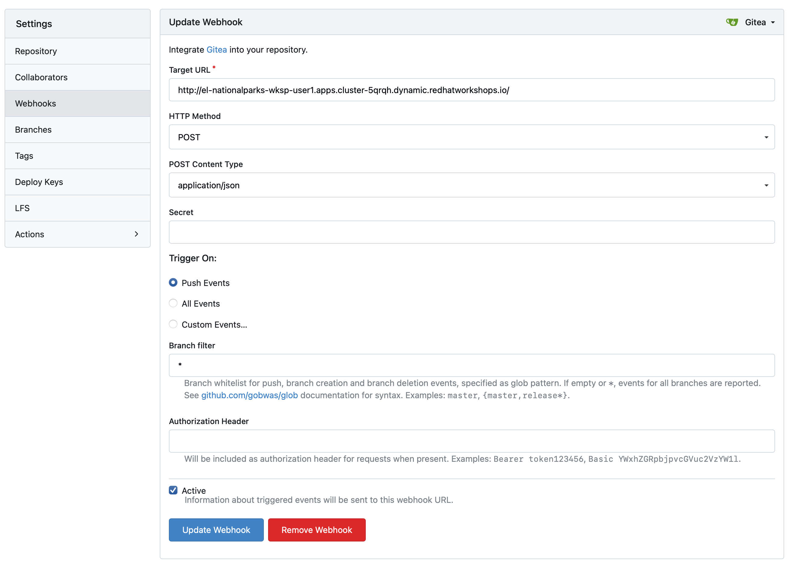 oc create -f https://gitea.apps.cluster.example.com/userX/nationalparks/raw/branch/master/pipeline/nationalparks-triggers.yaml -n wksp-userX