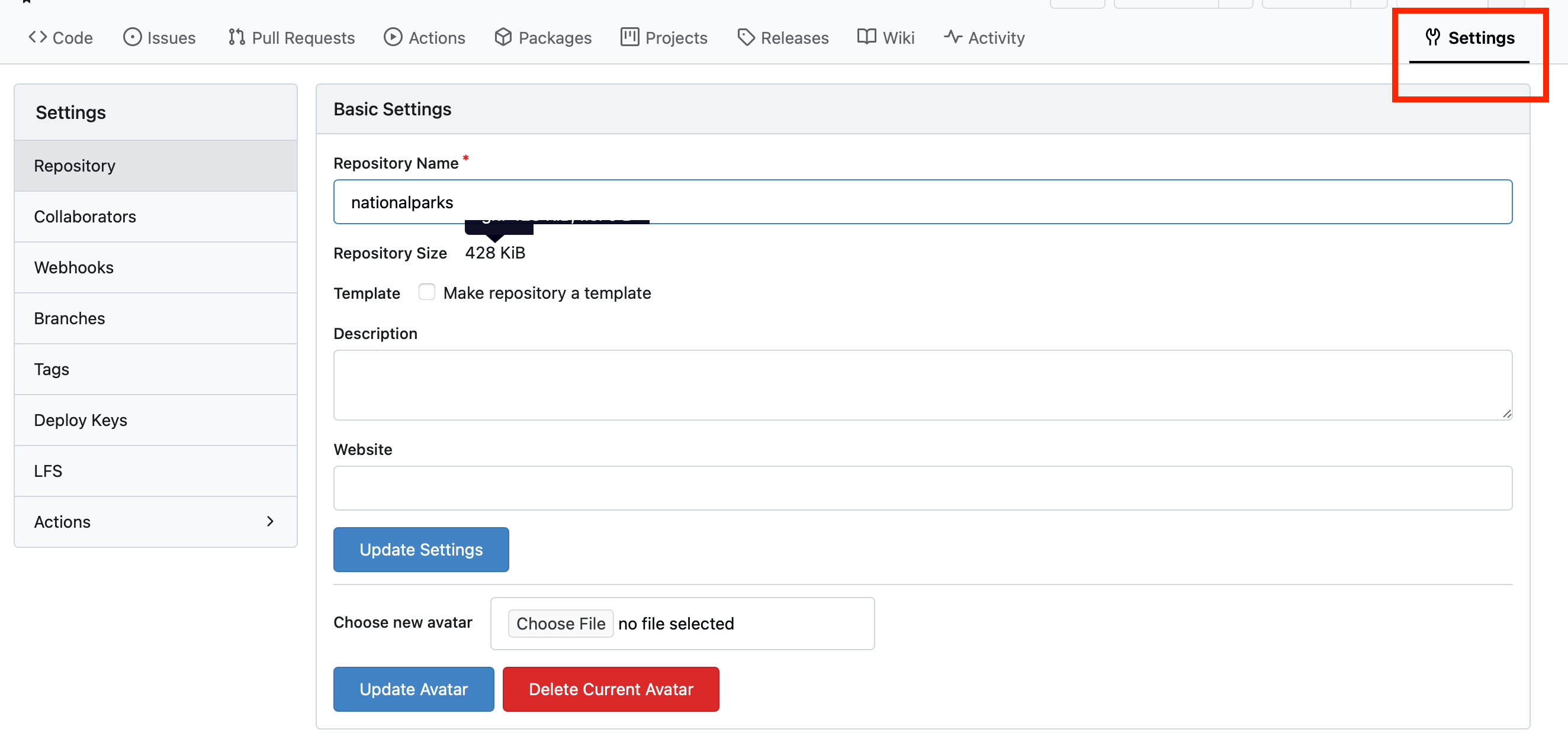that you have on Gitea by clicking the Gitea tab on the right side of this page, then open the nationalparks repository.