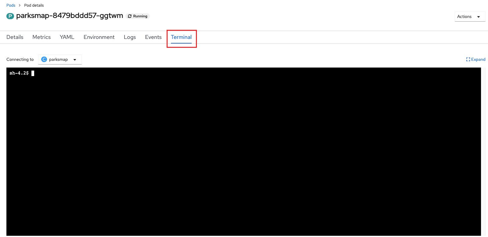 Once you are viewing the information for the selected Pod, click on the Terminal tab to open a shell session.