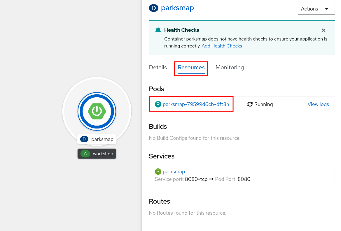 To access a Pod’s terminal via the Web Console, go to the Topology view, click the parksmap entry, and then click on the Pod.