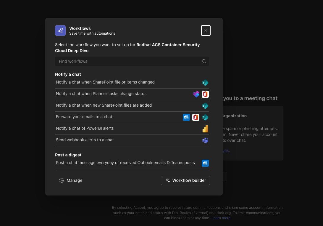 In this guide, we will show you how to integrate Red Hat Advanced Cluster Security (RHACS) with Microsoft Teams by setting up an Incoming Webhook in Teams and configuring it in RHACS to receive security alerts.