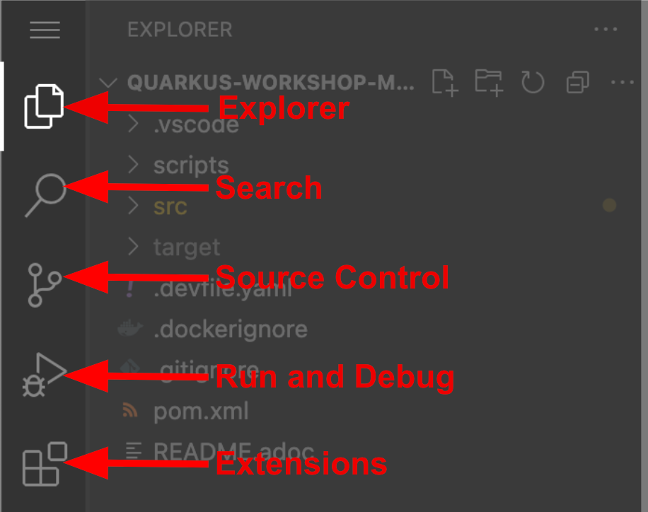 Explore the icons on the left for navigating between project explorer, search, version control (e.g. Git), debugging, and other plugins. You’ll use these during the course of this workshop. Feel free to select them and see what they do: