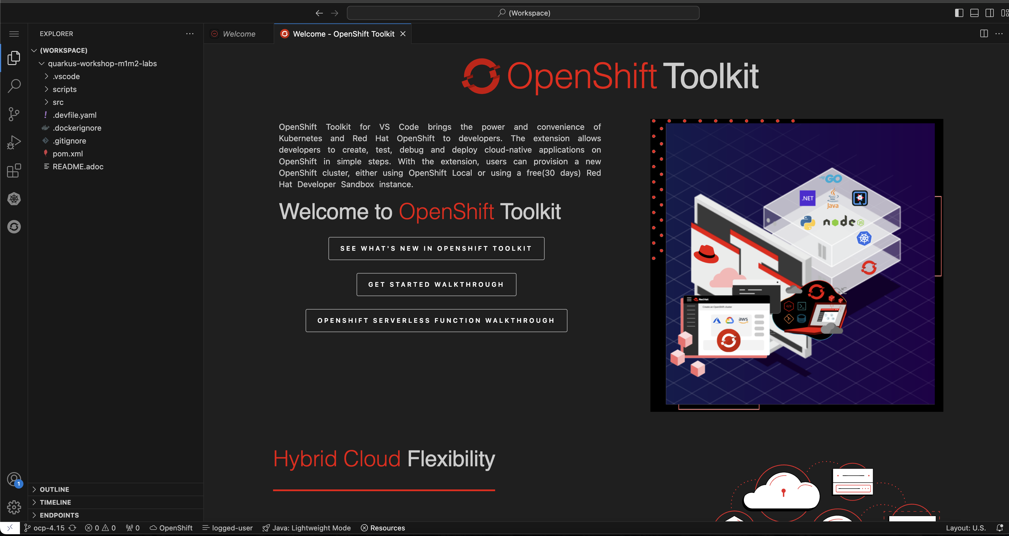 This workshop’s IDE is based on Eclipse Che (which is in turn based on MicroSoft VS Code editor).