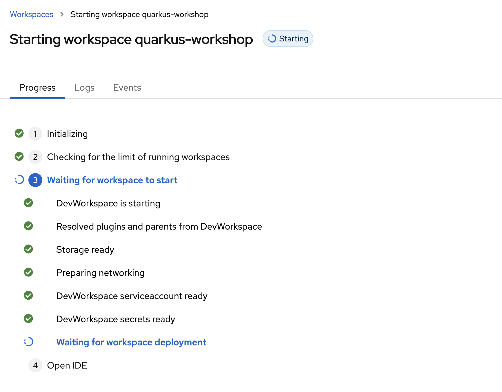 The next page will display progess as devspaces is Starting workspace quarkus-workshop. It takes about 60 seconds to finish the process.
