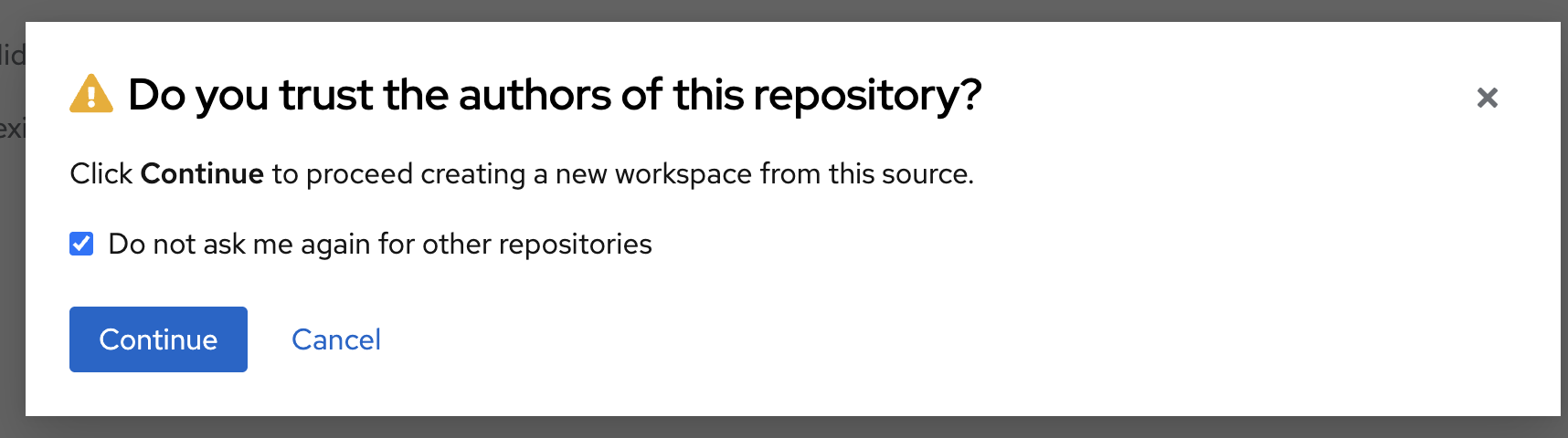 Do not ask again for other repositoriesto continue using your workspace. -