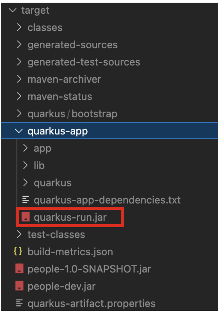 target/quarkus-app/directory:quarkus-run.jar- being an executable fast jar. Be aware that it’s not an über-jar as the dependencies are copied into thetarget/libdirectory.