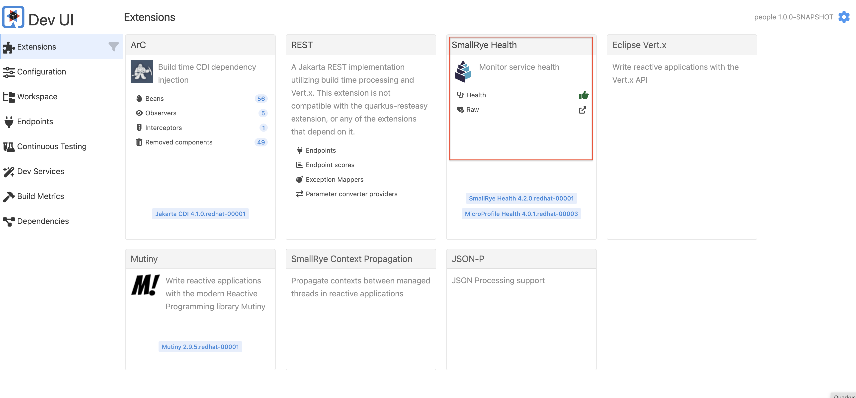 When you go back to Dev UI, you will see a new SmallRye Health extension: