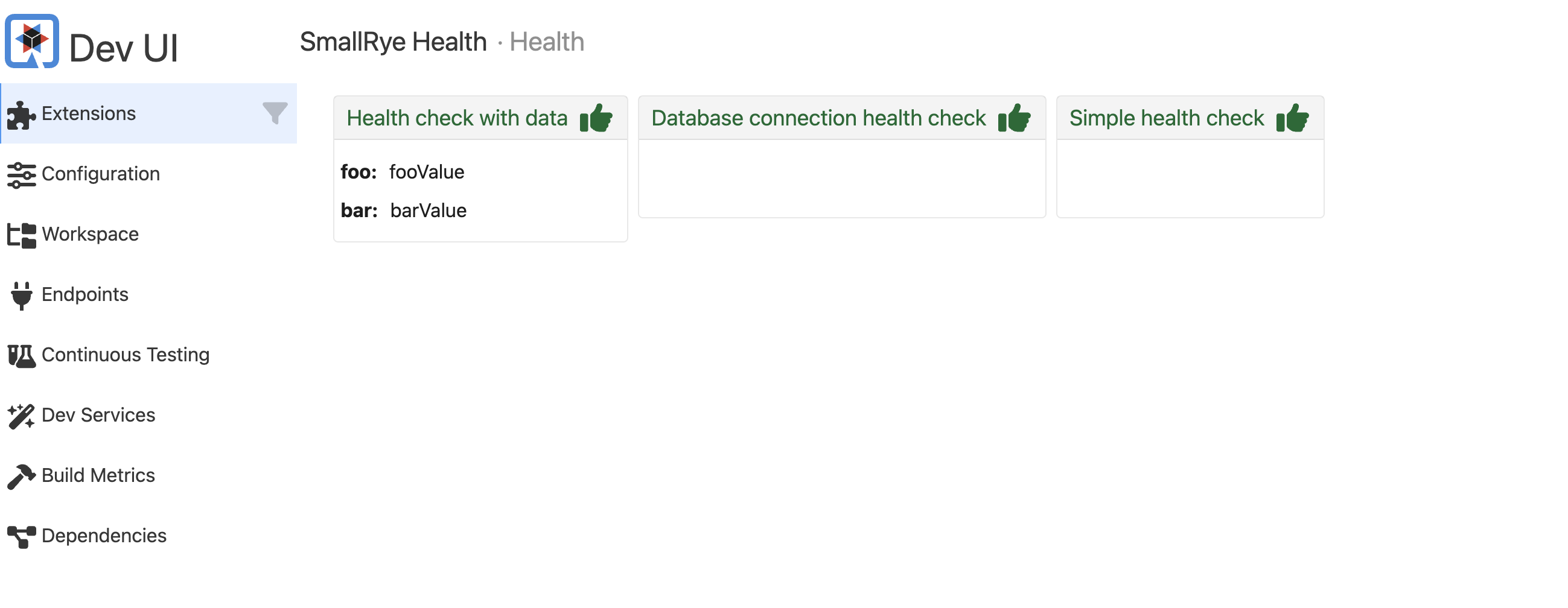 { "status": "UP", "checks": [ { "name": "Health check with data", "status": "UP", "data": { "foo": "fooValue", "bar": "barValue" } }, { "name": "Database connection health check", "status": "UP" } ] } -