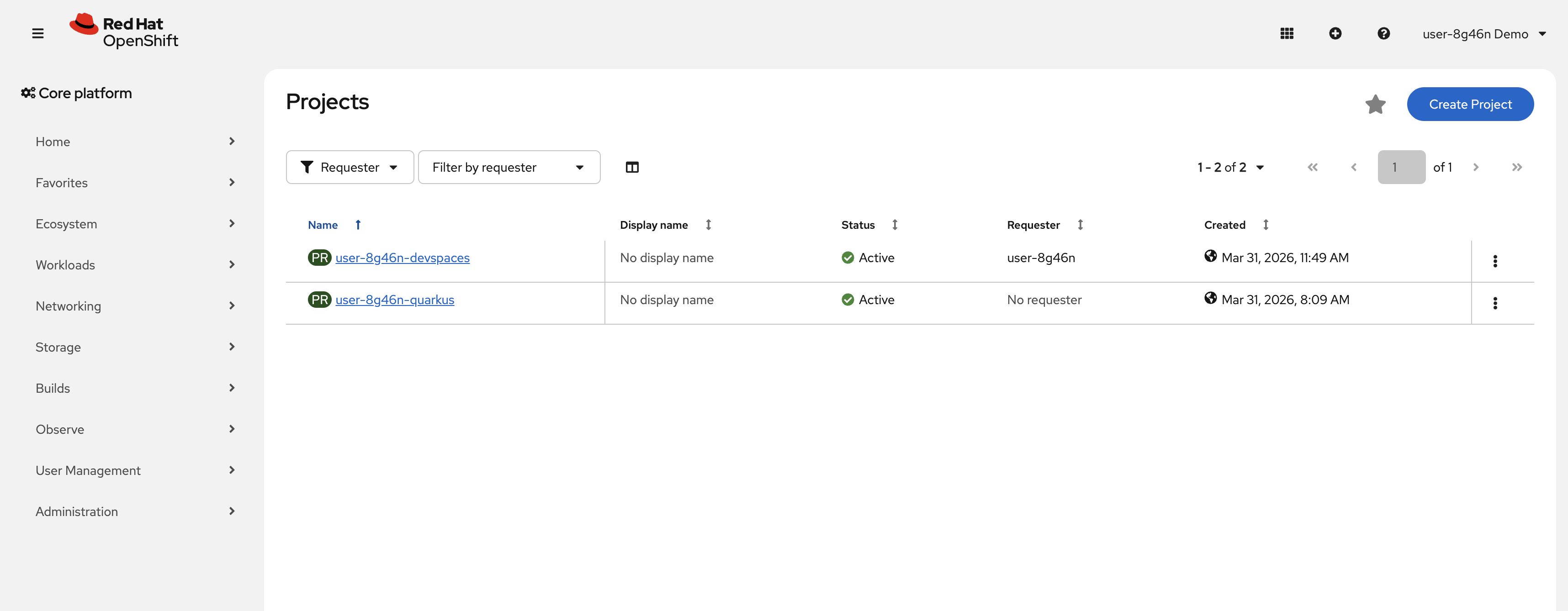 For this scenario, a project has been created for you called {user}-quarkus. You will use this project to deploy your developed project in the next step.