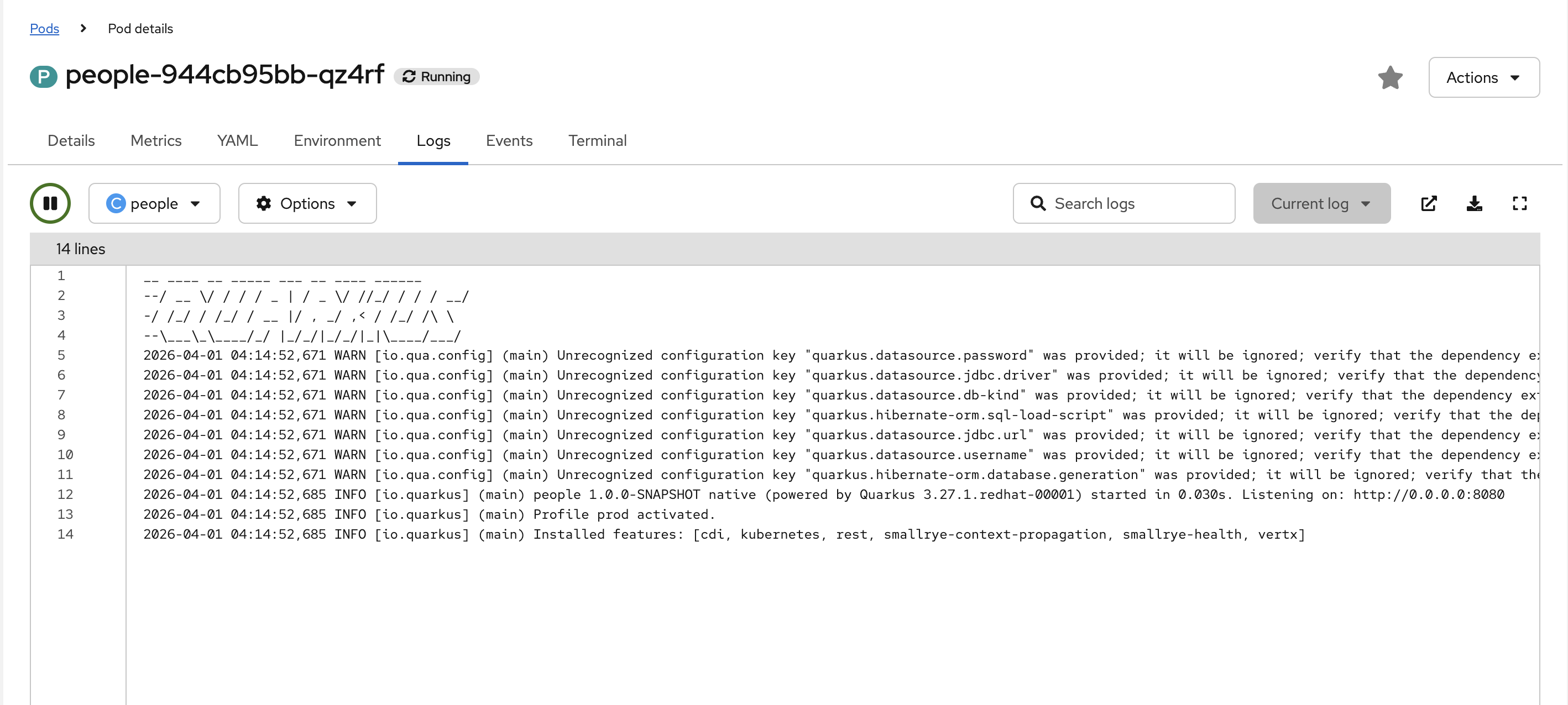 src/main/resources/application.propertiesfor deploying the application to OpenShift. native compilation usingMandrelbuilder image:%prod.quarkus.kubernetes-client.trust-certs=true %prod.quarkus.kubernetes.deploy=true %prod.quarkus.kubernetes.deployment-target=openshift %prod.quarkus.openshift.build-strategy=docker %prod.quarkus.openshift.route.expose=true %prod.quarkus.openshift.route.target-port=http %prod.quarkus.openshift.route.tls.termination=edge %prod.quarkus.openshift.route.tls.insecure-edge-termination-policy=Allow quarkus.openshift.deployment-kind=Deployment quarkus.container-image.group={user}-quarkus quarkus.container-image.registry=image-registry.openshift-image-registry.svc:5000Let’s review what each of the above properties do: