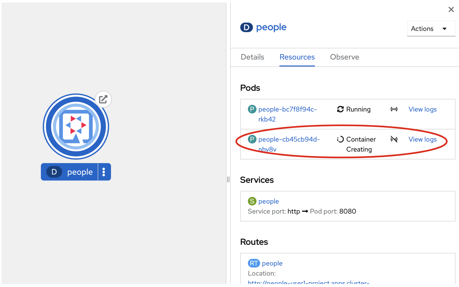 You’ll see in the Topology view that the app is re-deployed with the new settings and the old app will be terminated soon after: