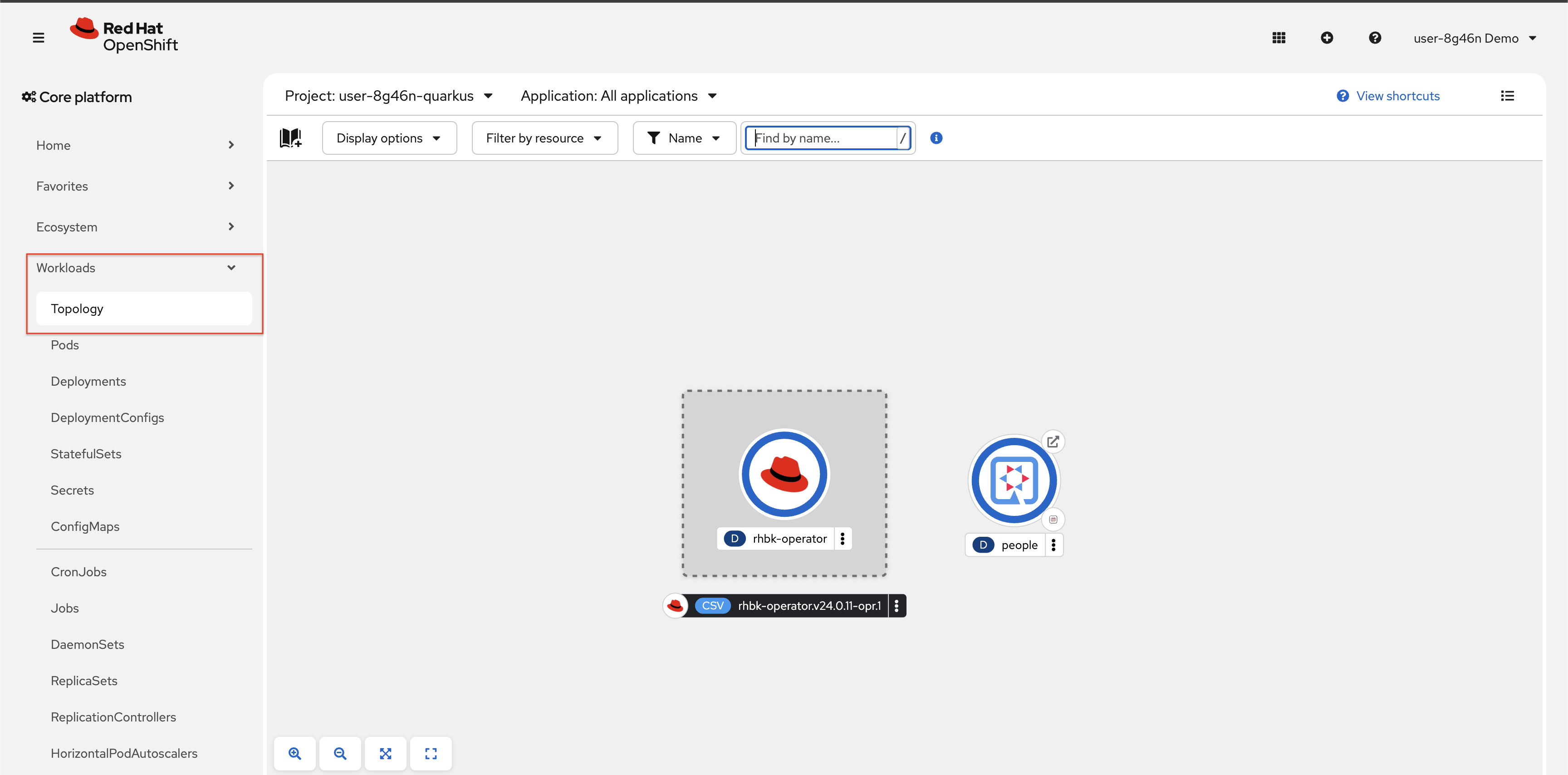Click on Workloads → Topology navigation menu on the left to view the topology of your project.