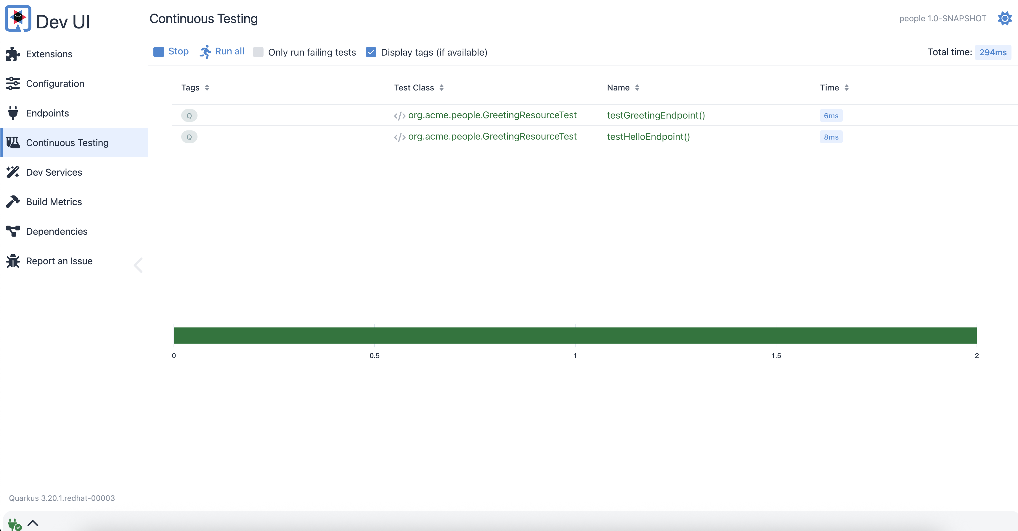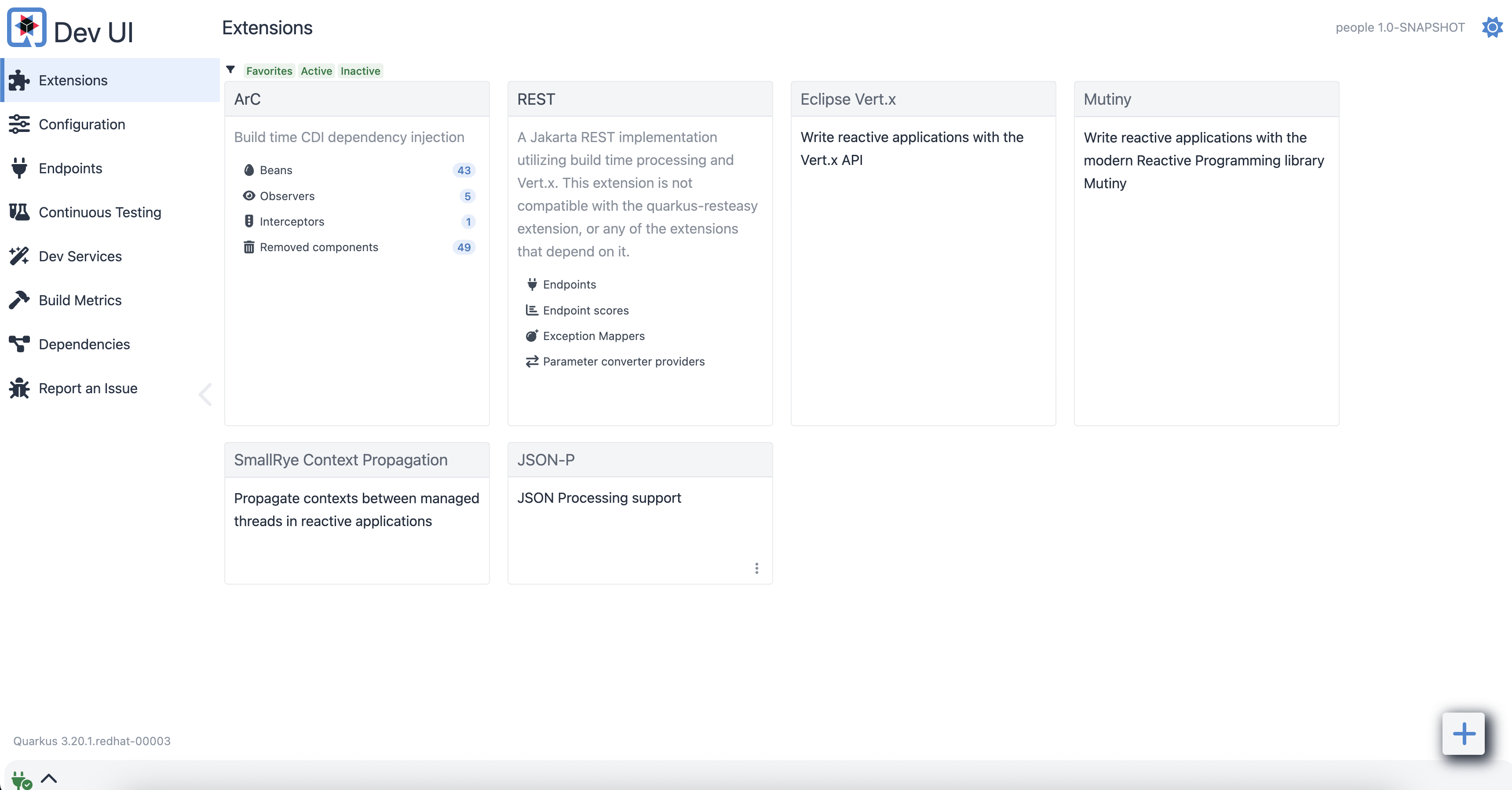 Quarkus also provides a new experimental Dev UI, which is available in dev mode (when you start quarkus with mvn quarkus:dev) at /q/dev by default. It allows you to quickly visualize all the extensions currently loaded, see their status and go directly to their documentation.