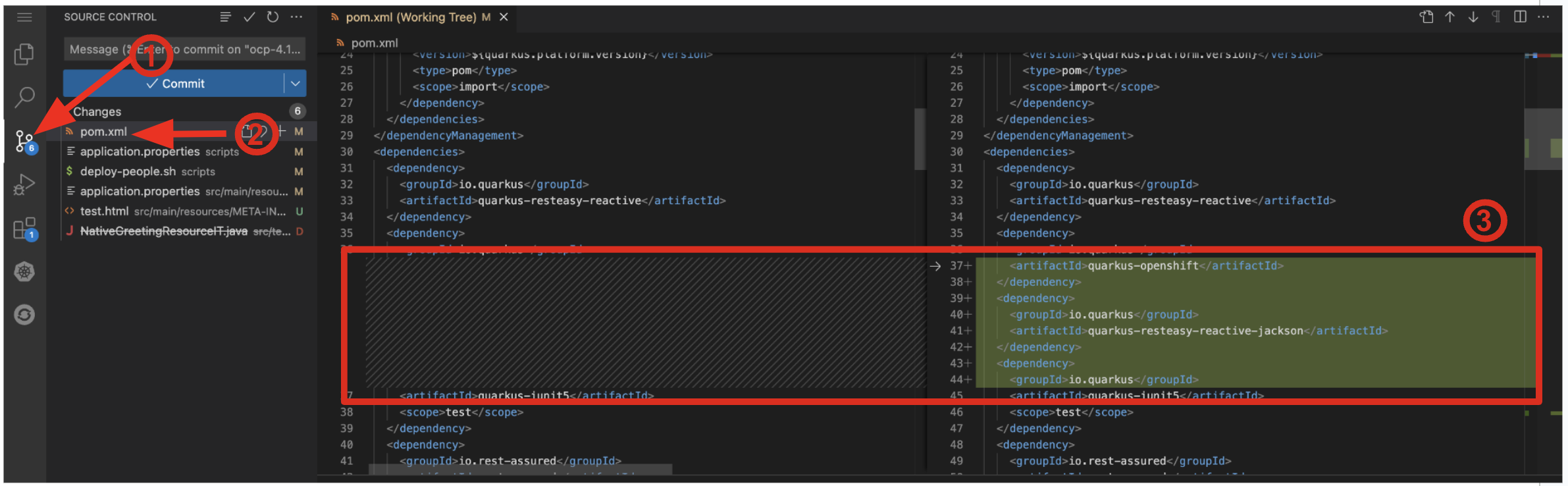 You may see other apparent differences due to whitespace and/or the re-shuffling of XML elements when you ran mvn quarkus:add-extension.
