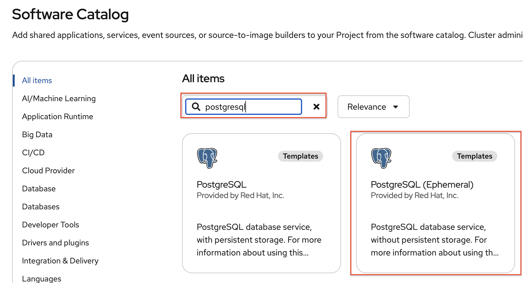 Then, Type in PostgreSQL (Ephemeral) in the search box, and select the PostgreSQL (ephemeral):