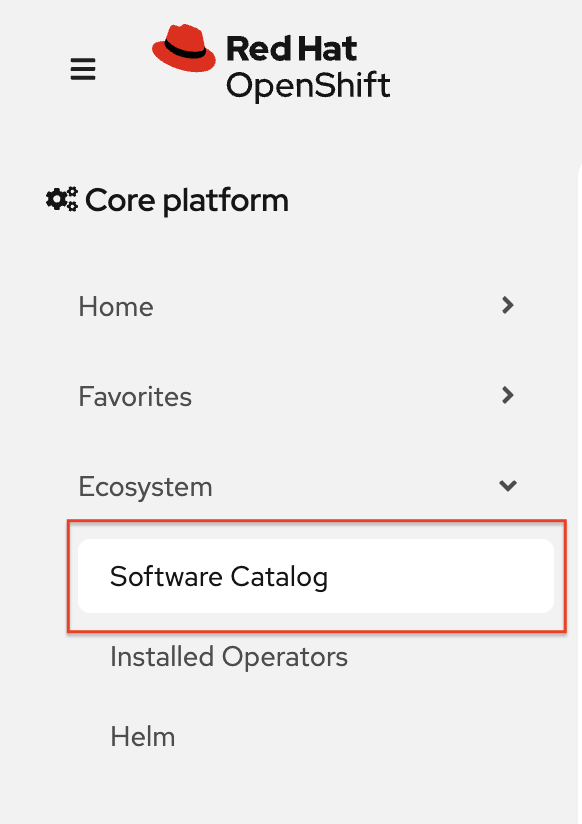 Keycloak needs a database to store its data. We’ll use Postgres. Back on the OpenShift web console, select Software Catalog, under Home on the left.