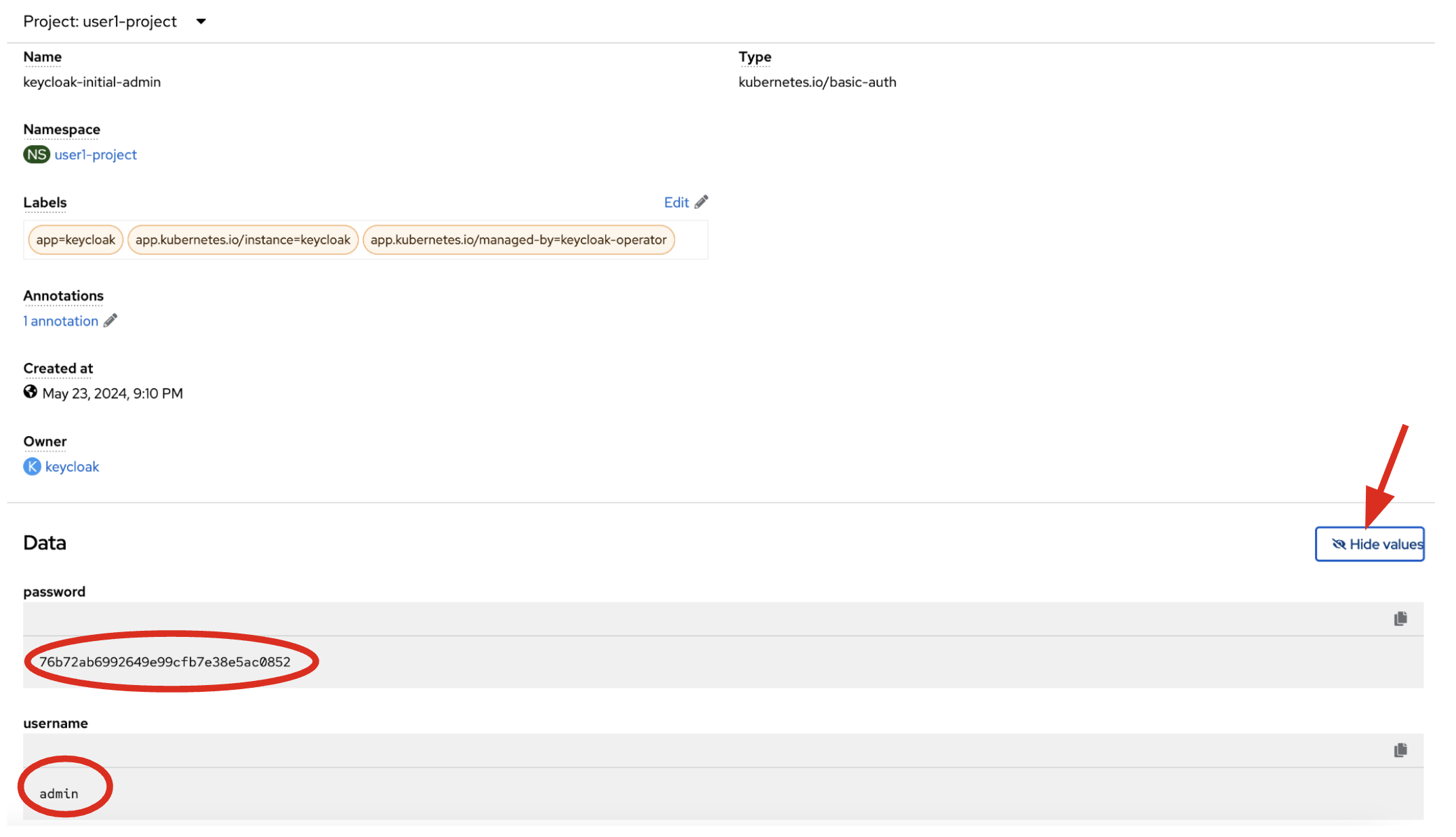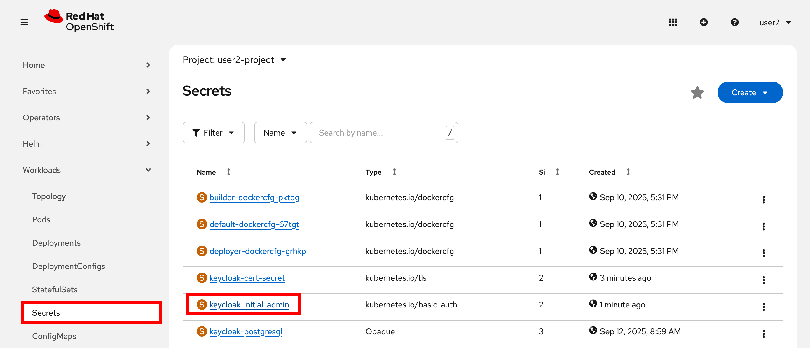 When you use the keycloak operator, it will generate an initial administrator username/password in a Secret. Access the secret by clicking on Secrets, and find the keycloak-initial-admin secret, and click on it: