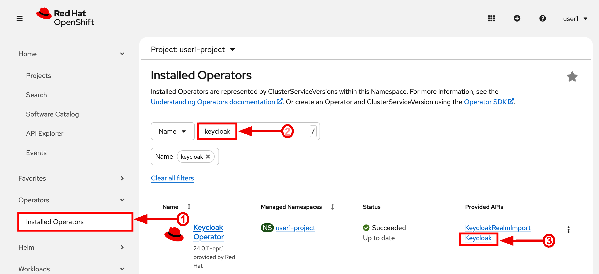 By creating an instance of a Keycloak object, the Keycloak operator will process it and instantiate a new Keycloak server. In the OpenShift web console, click on Installed Operators in the sidebar menu.