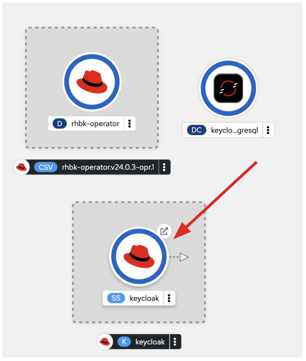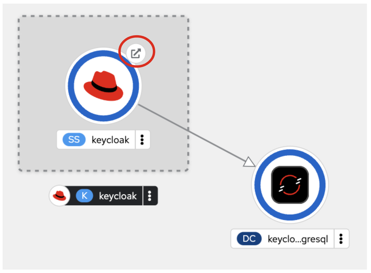 Back on the OpenShift web console topology page, click the small "open" icon at the upper right of the Keycloak deployment: