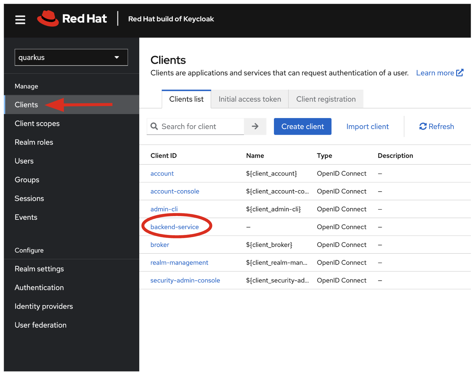 We have also created a Client within the realm that will be used by our backend inventory service called backend-service. This enables the service itself to authenticate with Keycloak to retrieve realm data. Click on Clients to see this client.