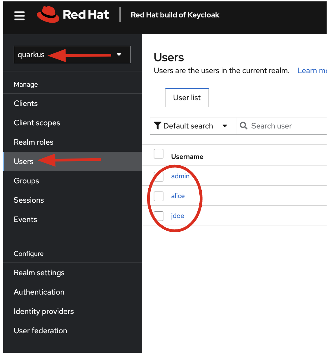 Within the new realm, click on Users to see the pre-created users admin, alice, and jdoe: