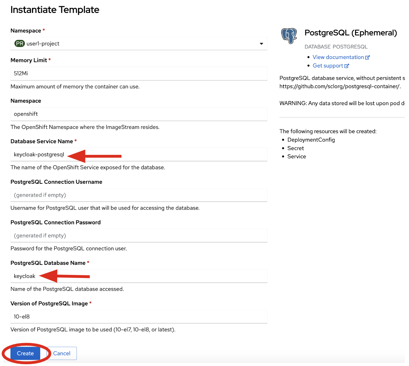 Leave the rest as-is, including the username and password, which will be auto-generated for you and you’ll refer to them later. Finally, click Create:
