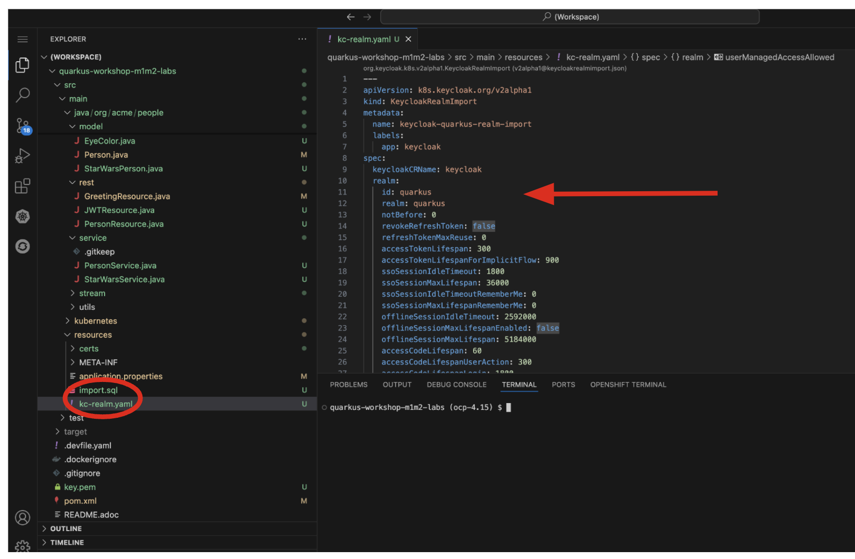 We have pre-defined a new realm for this lab, in the inventory/src/main/resources/kc-realm.yaml file. The file contains a definition of the realm, which you can see by opening the file in DevSpaces: