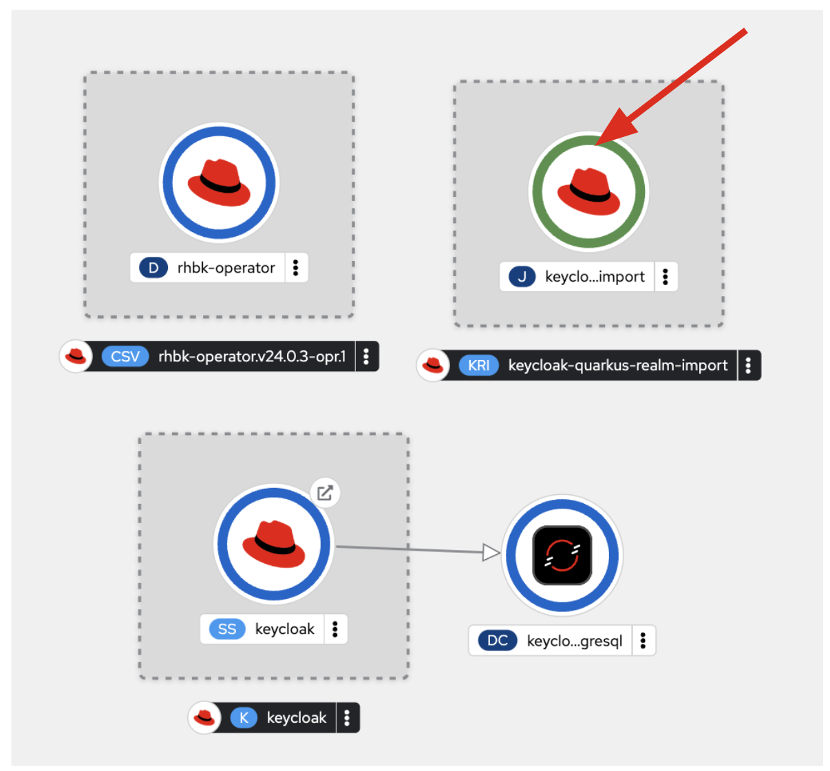 You will see a new Job created, wait for it to complete (for the circle to turn green) and for the Keycloak pod to automatically restart: