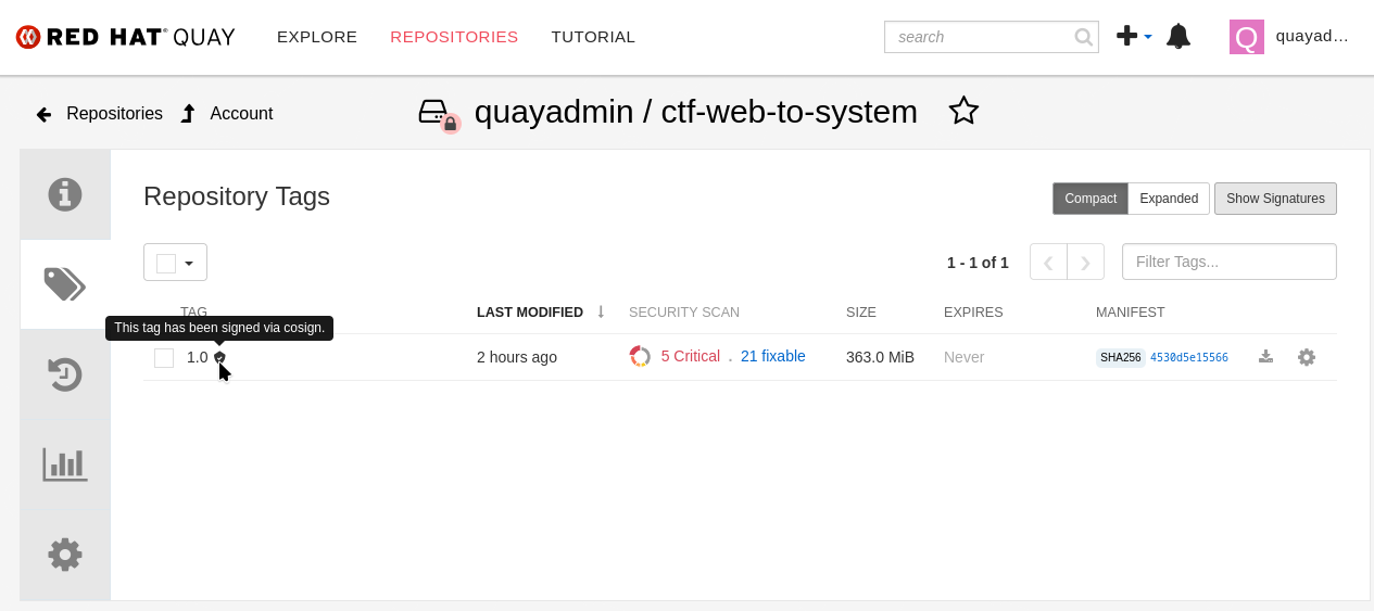 cosign tree. Run the following command in the terminal:cosign tree $QUAY_URL/$QUAY_USER/patient-portal-frontend:1.0📦 Supply Chain Security Related artifacts for an image: quay.apps.cluster-m2mgb.dyn.redhatworkshops.io/quayadmin/patient-portal-frontend:1.0 └── 🔐 Signatures for an image tag: quay.apps.cluster-m2mgb.dyn.redhatworkshops.io/quayadmin/patient-portal-frontend:sha256-22f99a3899129e277d305e187c8d24180c14a050d91455bd3369911f366c4dfb.sig └── 🍒 sha256:c20e35a851fe1f348be662e94f3095edfe85955d1d7b9ee8de2afbfc3c94f7e2We can also log in to Quay[{quay_console_url}] using the Quay credentials: